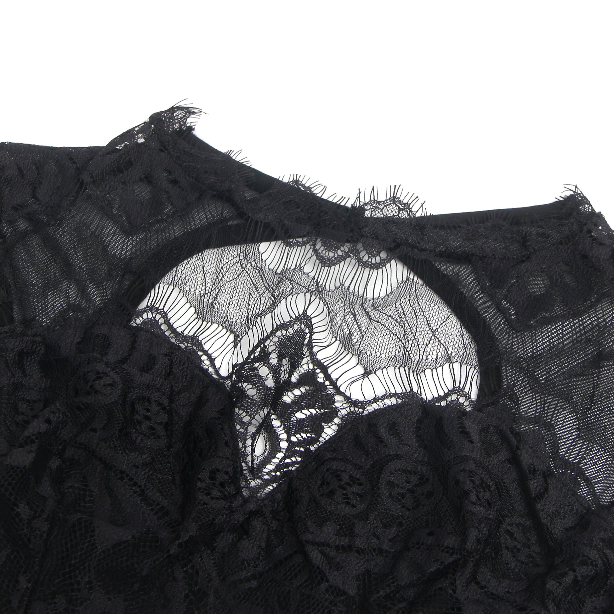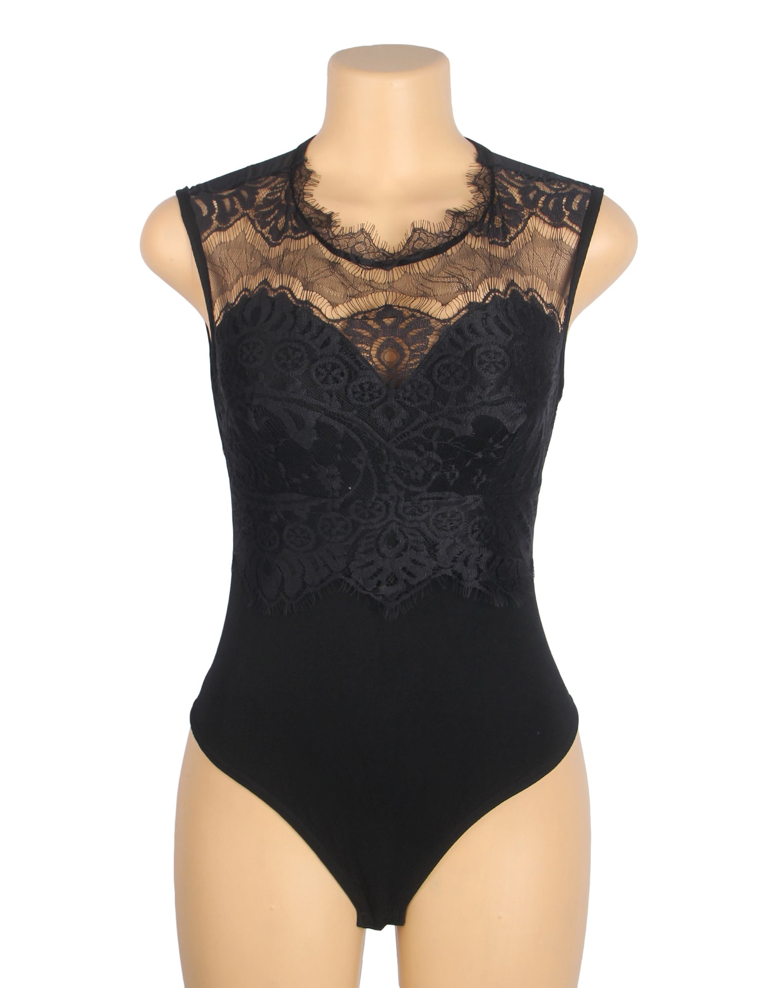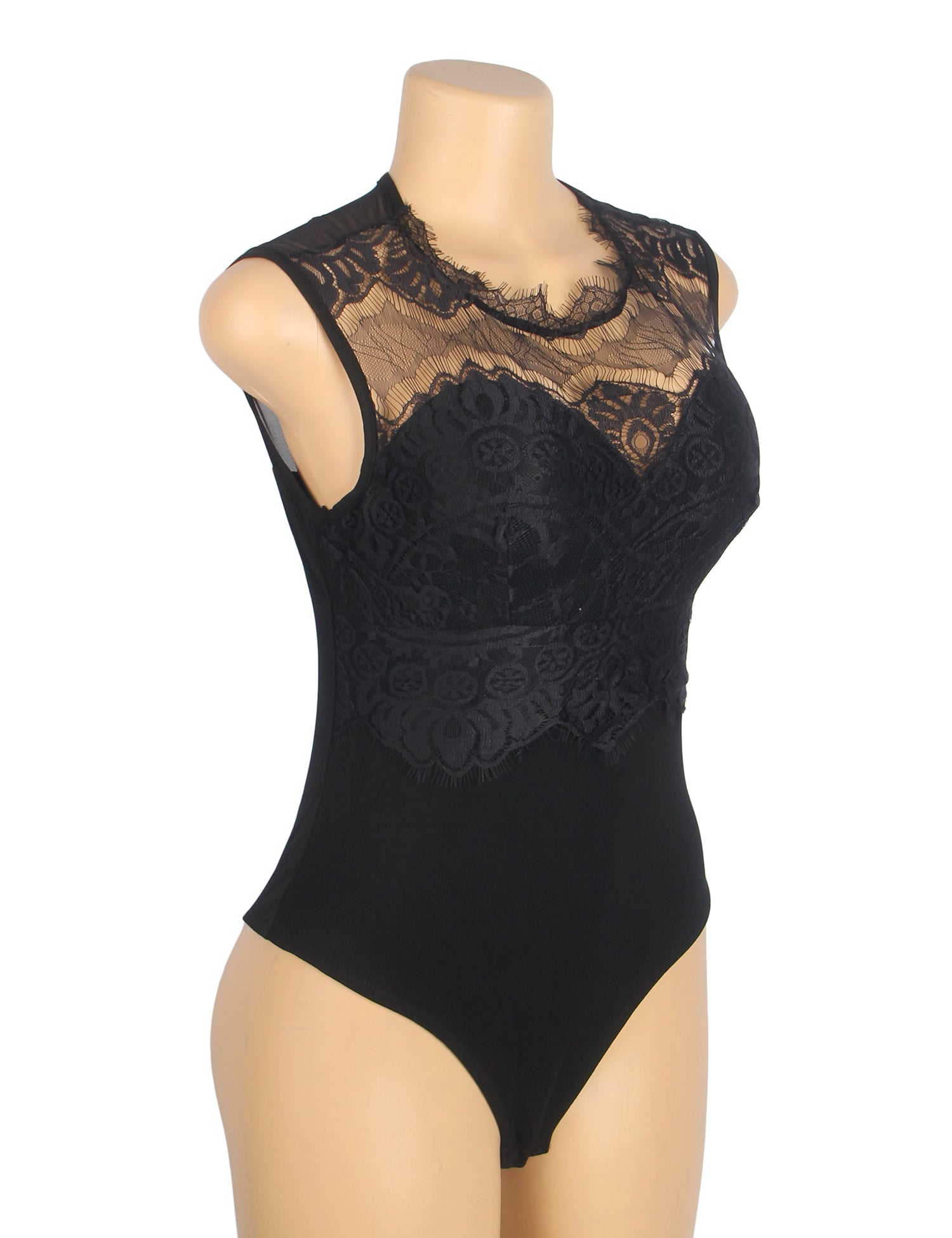 Schwarzer, sexy ärmelloser Body mit Wimpernspitze und offenem Schritt