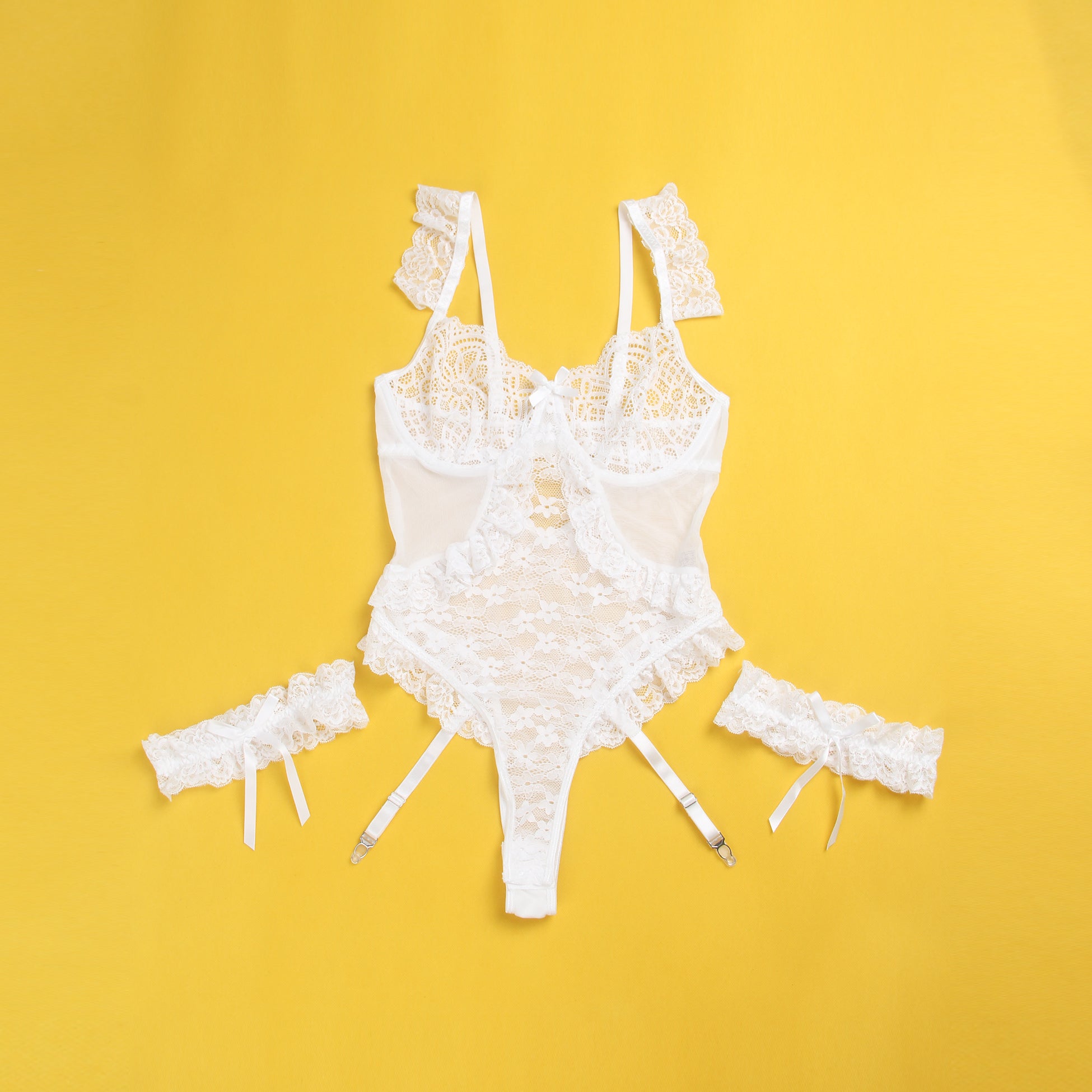 Weißer, sexy Jacquard-Spitzen-Body ohne Schritt mit Strumpfband