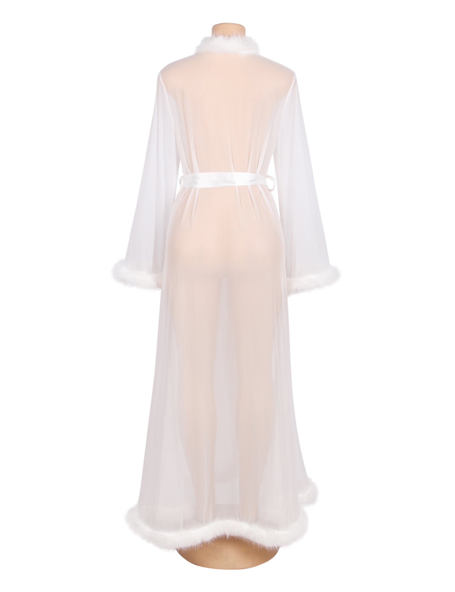 • Weißer, sexy langer Morgenmantel aus Mesh mit Imitationspelzbesatz und Gürtel