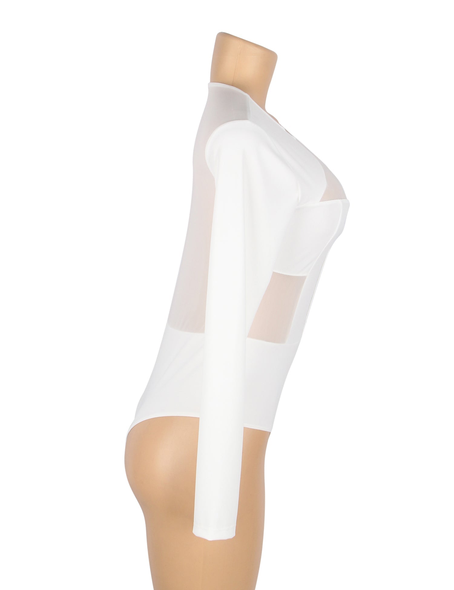 • Weißer, sexy Badeanzug aus Stoff und Mesh mit langen Ärmeln und offenem Schritt