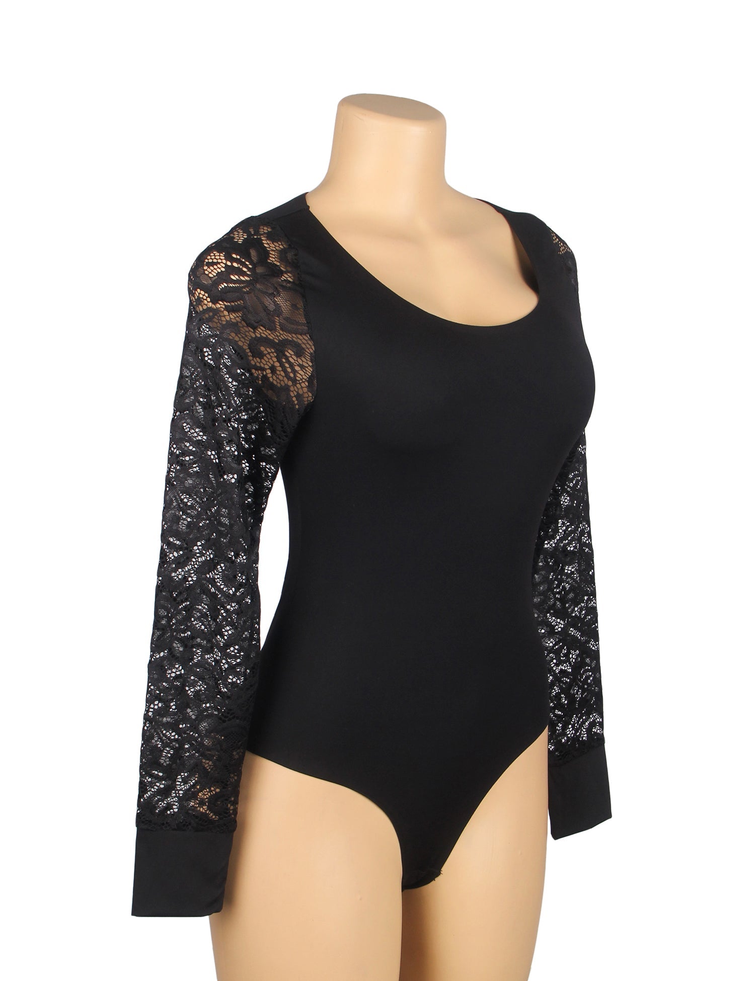 body de bain noir sexy en dentelle, manches longues, col rond et entrejambe ouverte
