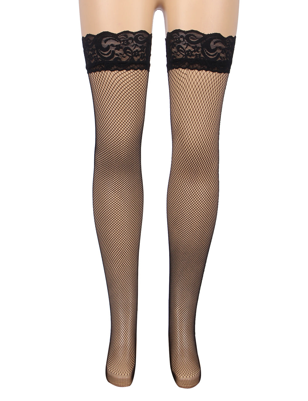 Black Fishnets Thigh High Stockings Silicone Lace Top Stay Up Sheer Hosiery