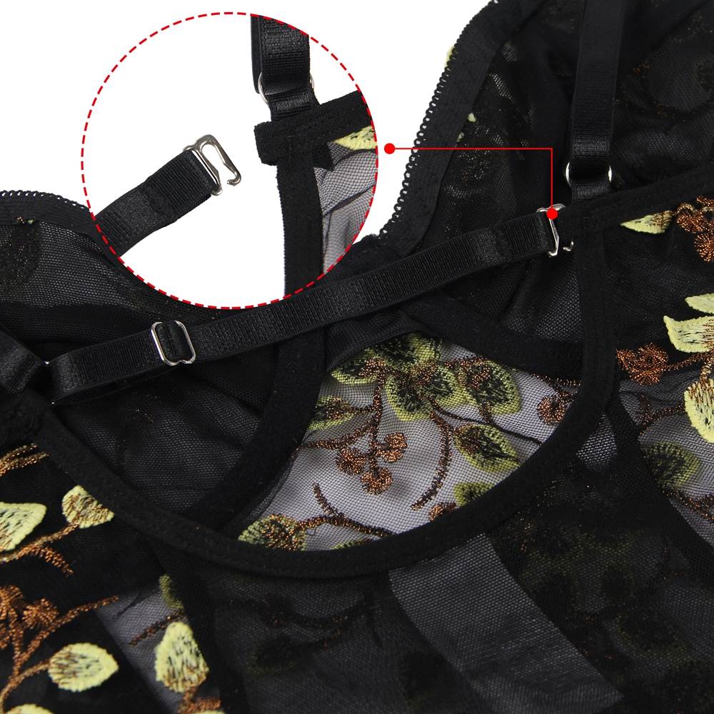 • Fashion Embroidery Black Mesh Bodysuit With Underwire