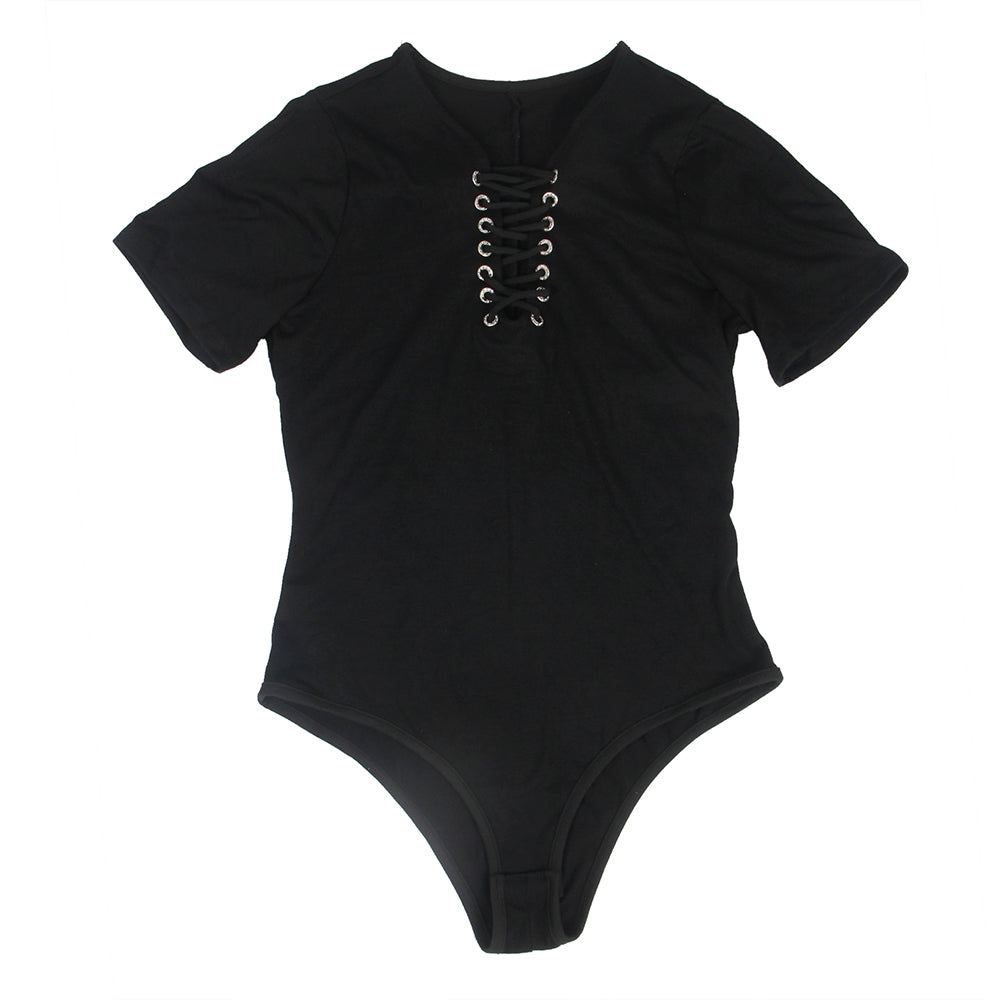 • Open Crotch One-piece Short Sleeve Black Solid Color Fashion Bodysuit