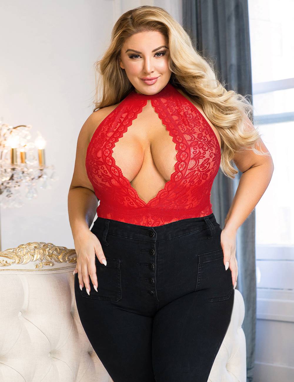 • Plus Size Red Exquisite Lace Open Cup Teddy