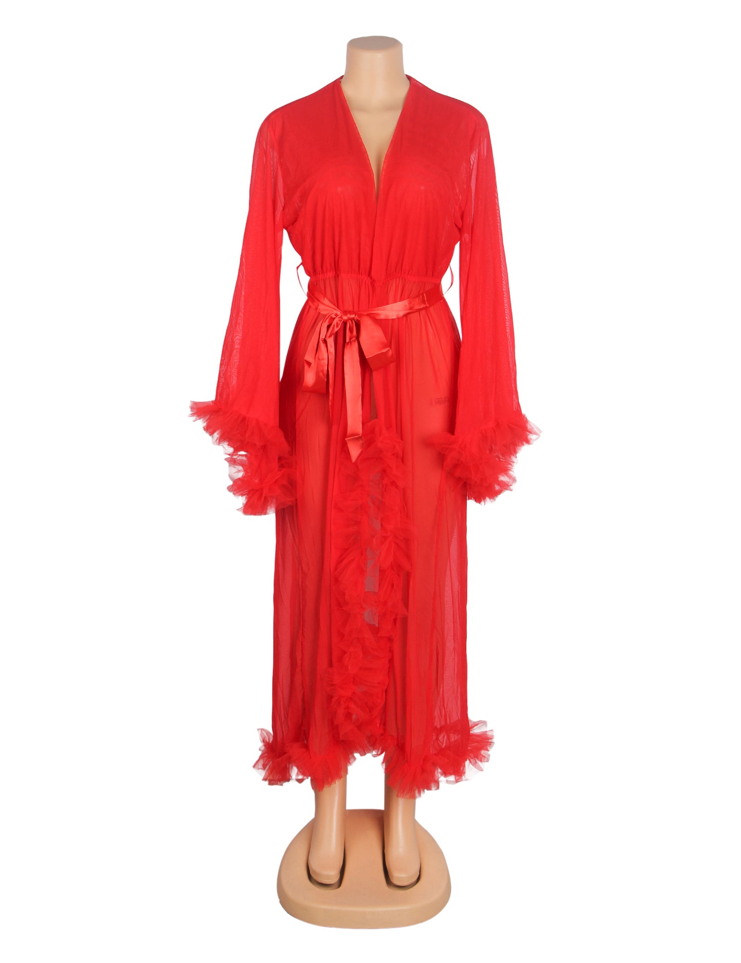 Red Sexy Mesh Ruffled Long Robe With Belt