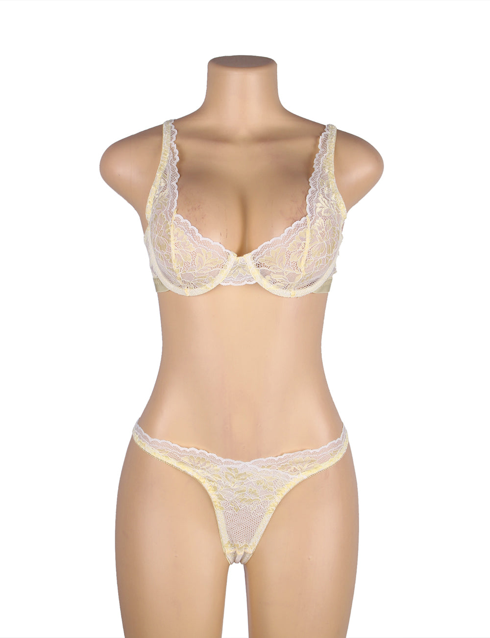 • Yellow Two Straps Floral Lace Underwire Bra Set